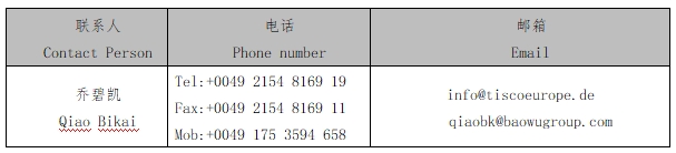 4.山西太鋼不銹鋼股份有限公司太鋼歐洲有限責(zé)任公司主要承擔(dān)歐洲市場太鋼鋼材產(chǎn)品的銷售,相關(guān)聯(lián)系人信息如下: