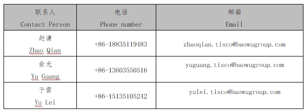 3.山西太鋼不銹鋼股份有限公司營銷中心海外貿(mào)易部是本公司產(chǎn)品出口的唯一官方渠道,相關(guān)聯(lián)系人信息如下: